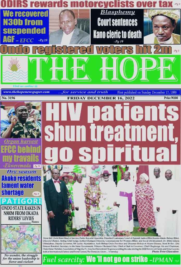 Speaking with The Hope, the State Coordinator, Ondo State Action Committee on AIDS (ODSACA), Dr. Dayo Adegbulu said the State, as at December 10, 2022, had 22,082 people on treatment, out of the estimated 26,856.